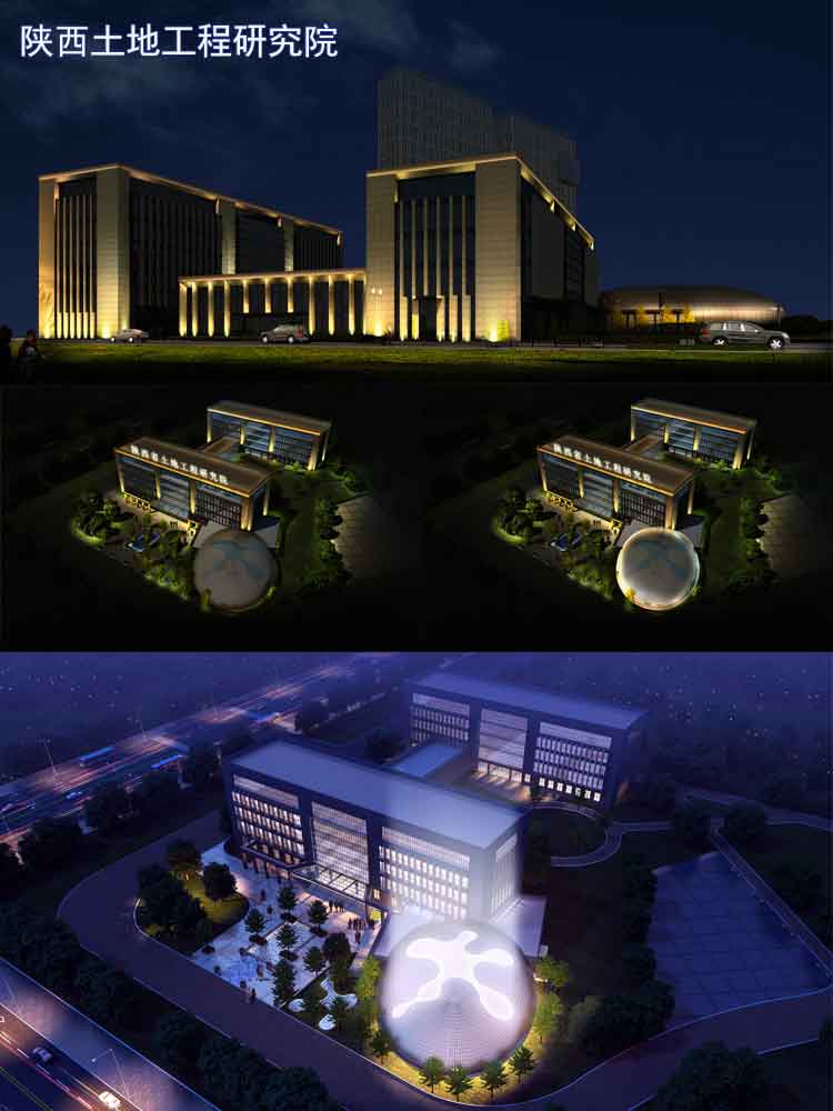 陜西土地工程研究院是承擔(dān)各類(lèi)建設(shè)工程勘察、設(shè)計(jì)、土建、安裝、市政、石化、公路、地鐵、機(jī)場(chǎng)、礦山、核電、裝飾、鋼結(jié)構(gòu)、古建園林工程施工。對(duì)于設(shè)計(jì)院辦公樓體亮化設(shè)計(jì),公司設(shè)計(jì)師跟根其前后樓體的建筑和廣場(chǎng)的球狀建筑的特點(diǎn),采用簡(jiǎn)單的洗墻燈和投光燈來(lái)進(jìn)行效果設(shè)計(jì),彰顯建筑的大氣與威嚴(yán)。